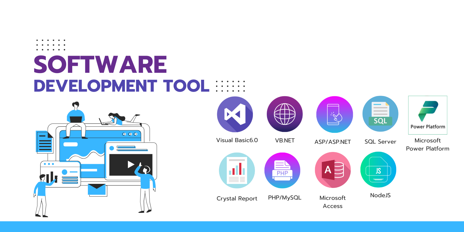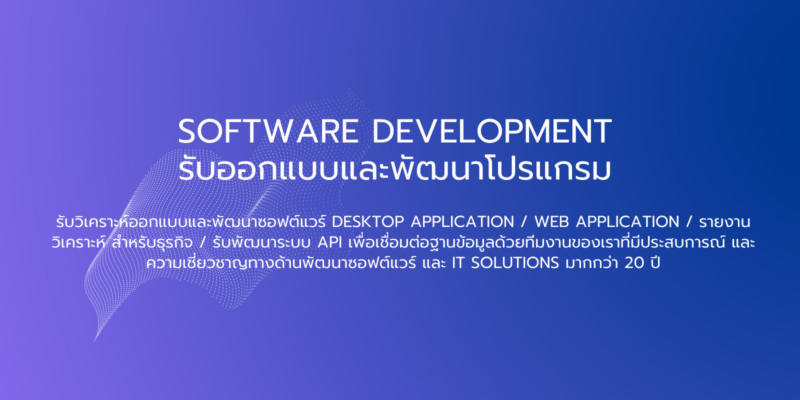 รับออกแบบและพัฒนาโปรแกรม รับวิเคราะห์ออกแบบและพัฒนาซอฟต์แวร์ Desktop Application / Web Application / รายงานวิเคราะห์ สำหรับธุรกิจ / รับพัฒนาระบบ API เพื่อเชื่อมต่อฐานข้อมูล ด้วยทีมงานของเราที่มีประสบการณ์ และความเชี่ยวชาญทางด้านพัฒนาซอฟต์แวร์ และ IT Solutions มากกว่า 20 ปี
